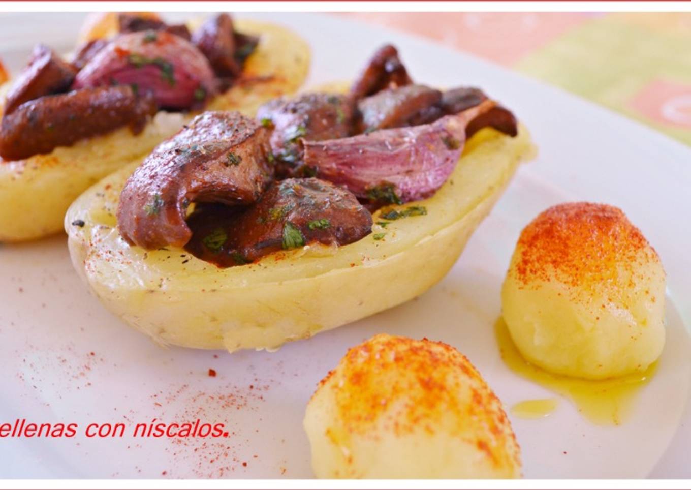 - Ahora con una cucharita pequeña ve haciendo un hueco en la patata para poder rellenar. (lo que saques de la patata, aprovéchalo si te apetece para hacer unas bolitas, con un poquito de pimentón de la Vera y un chorito de aceite). Espolvorea con sal la patata y rellena con los niscalos. Coloca las patatas rellenas en una fuente de horno, espolvorea con la pimienta y unas hojitas de romero y hornea durante 15 minutos. Saca y sirve inmediatamente.