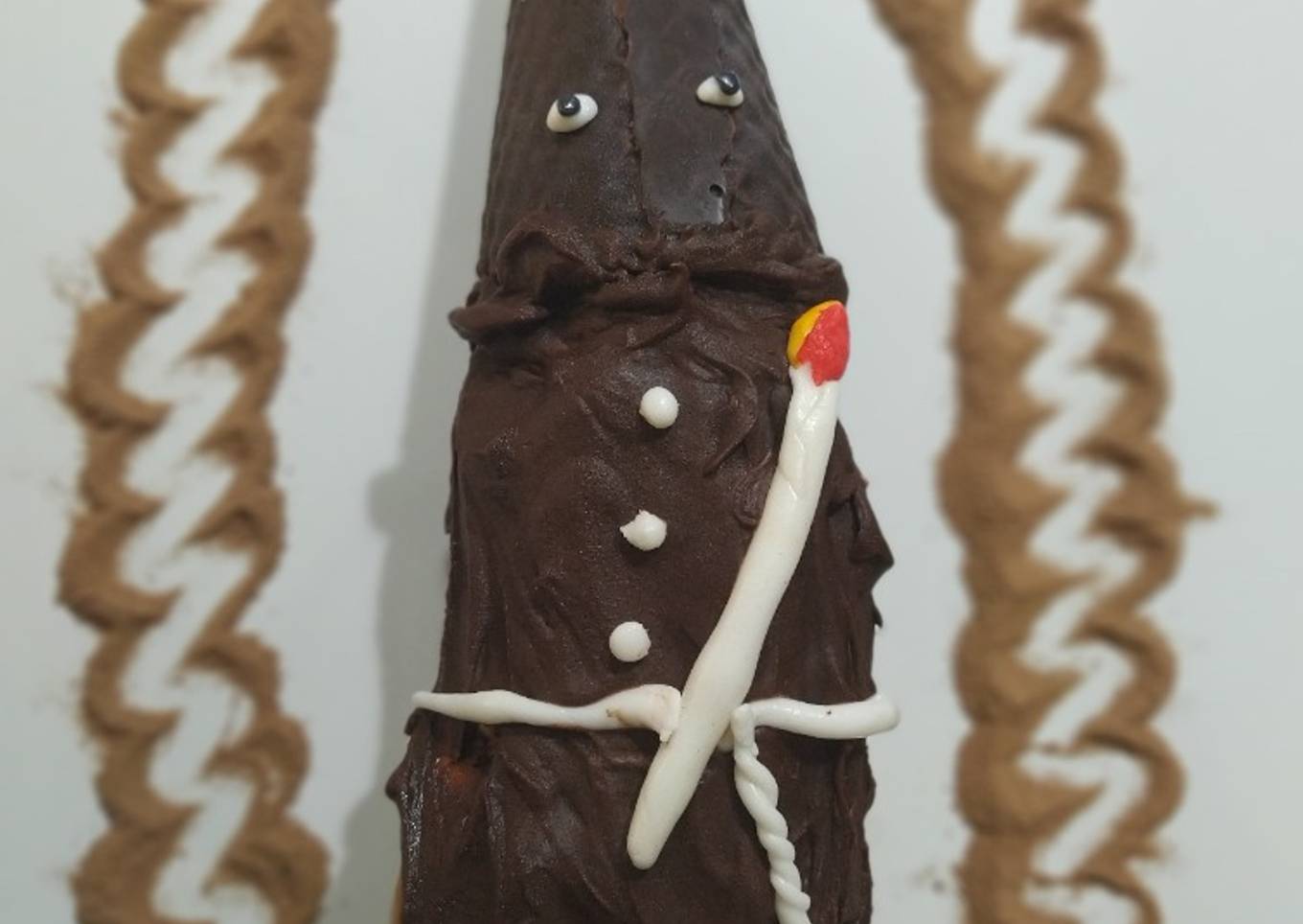 - Dejaremos un poquito de cobertura reservada. Ahora pondremos un palillo en la crema del palo y la crema del cucurucho para unir al nazarenos. Ahora con la cobertura reservada la pondremos por la junta para que haya más o menos uniformidad en el nazareno. Una vez acabado esto nos queda dar los últimos detalles para ello utilizaremos fondant y esto ya va a ir un poco al gusto de cada uno yo usé fondant blanco para botones, cingulo, ojos y cirio y amarillo y rojo para la vela.