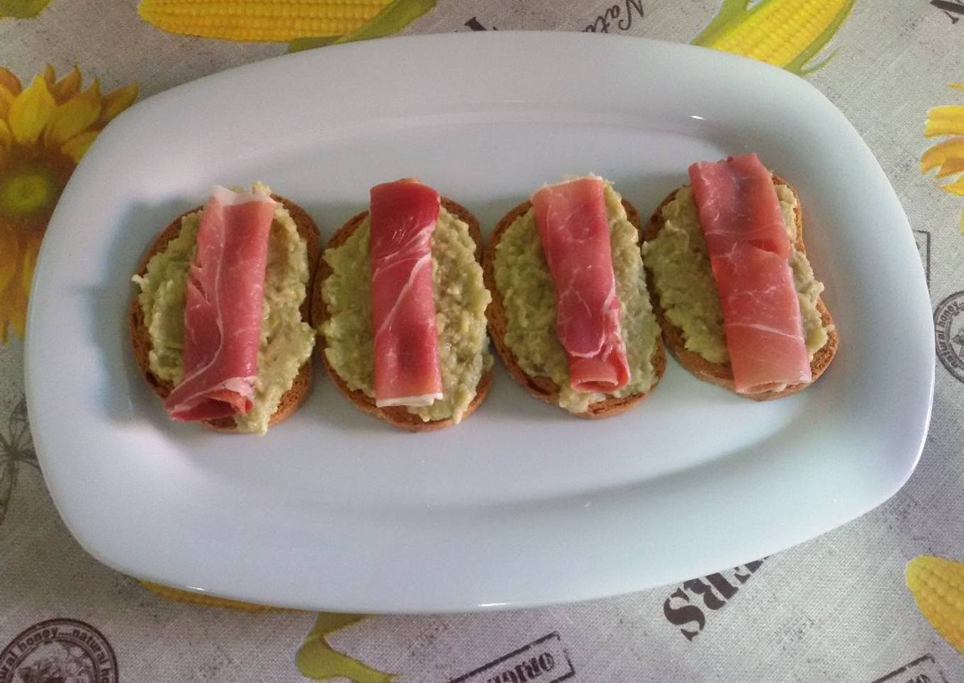 - Preparamos nuestra tapa, colocamos una capa de guacamole encima del pan y justo encima la loncha de jamón.