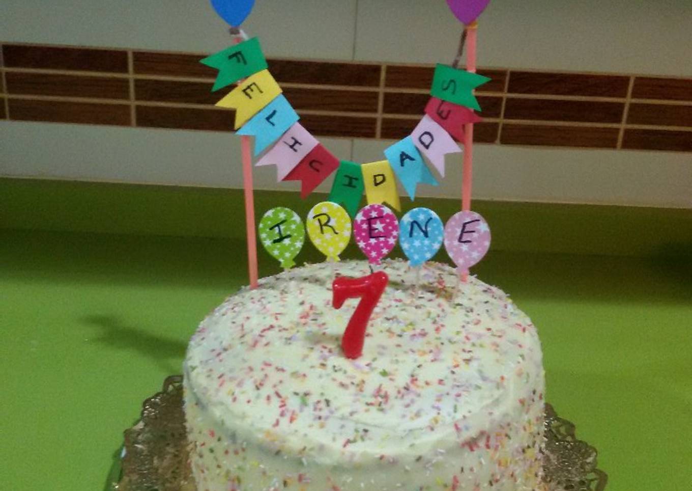 - Terminamos cubriendo la tarta por los lados y espolvoreamos fideos de colores. Al frigo.