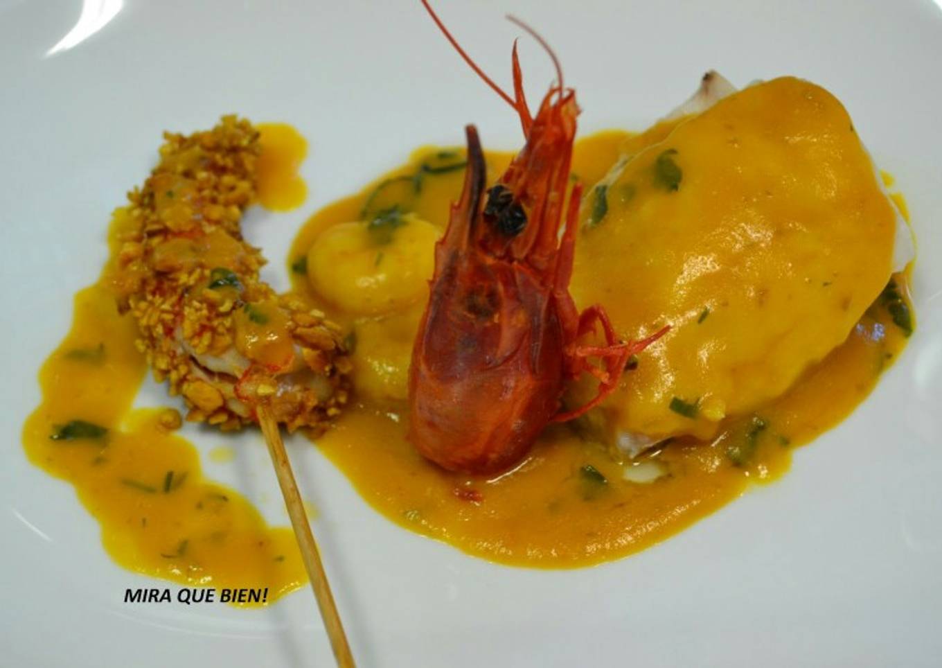 Merluza en salsa americana con crujiente de carabinero