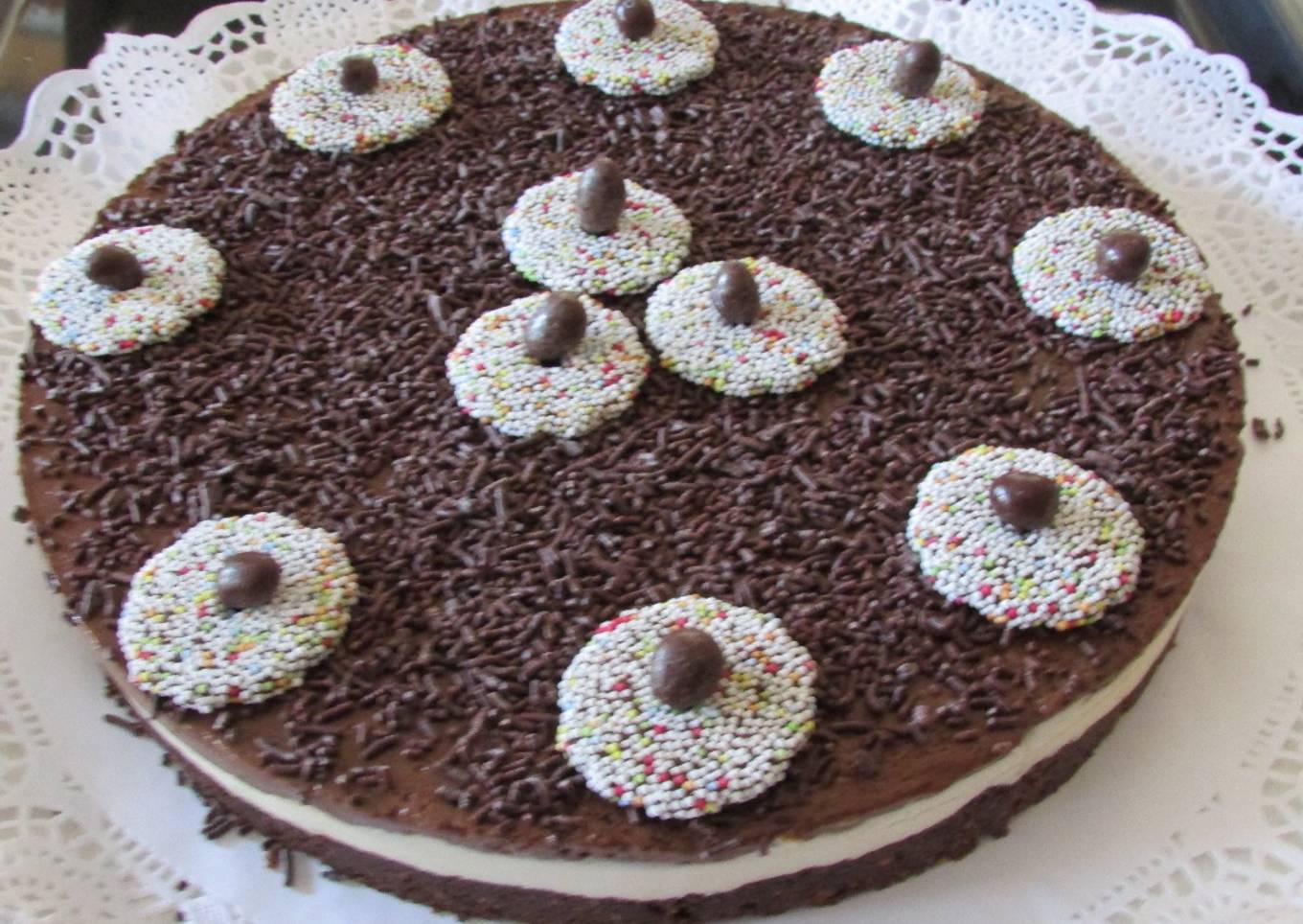 - Hacemos lo mismo con el chocolate negro y vertemos sobre la capa blanca, si la capa blanca la rayamos con un tenedor se quedarán las dos capas unidas cuando la cortemos.