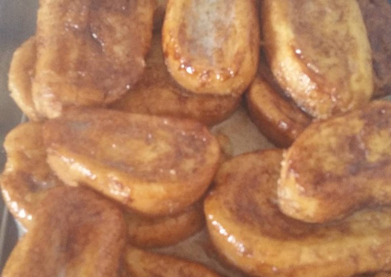 - Cuando acabe el tiempo con cuidado desenvolver las torrijas y pasarlas por una mezcla de azúcar y canela. Colocar en la bandeja del horno precalentado y meter 3 minutos en el grill.
