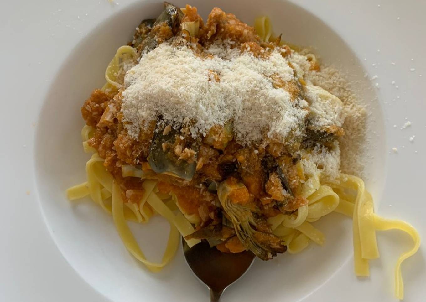 Pasta fresca con atún, alcachofas y tomate frito casero