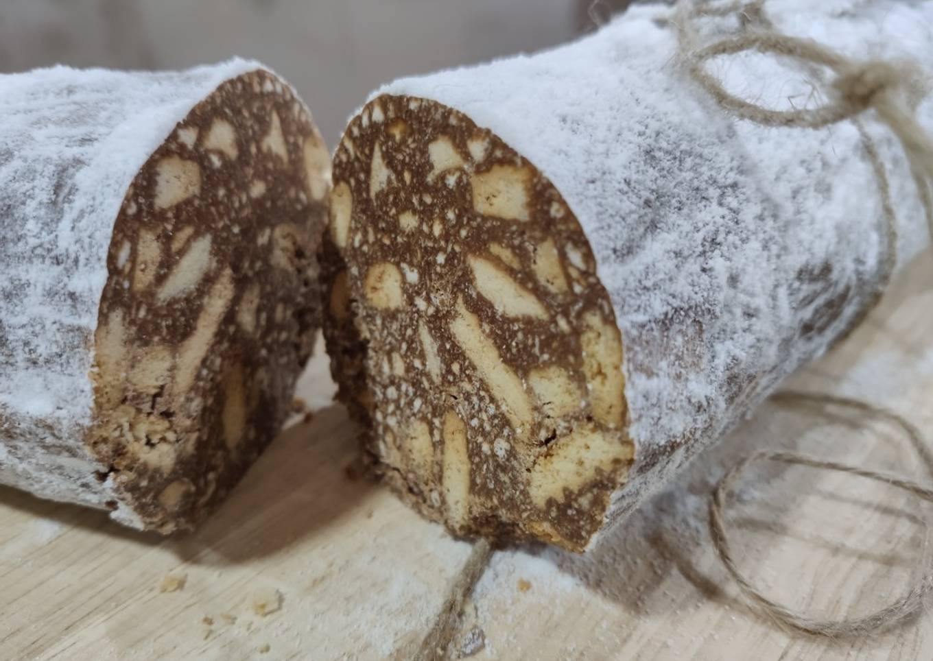 - Toca la presentación. Con azúcar glas lo espolvoreamos por todo el Salami y si sois curiosos, lo atais con cuerda y ya tenemos nuestro Salami. En casa más de uno pensó que era de verdad un Salami :)