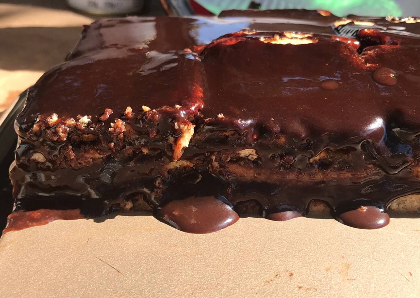 - Hacer otra capa de galletas, poner una capa de chocolate, otra capa de galletas mojas y una capa de crema de mantequilla.