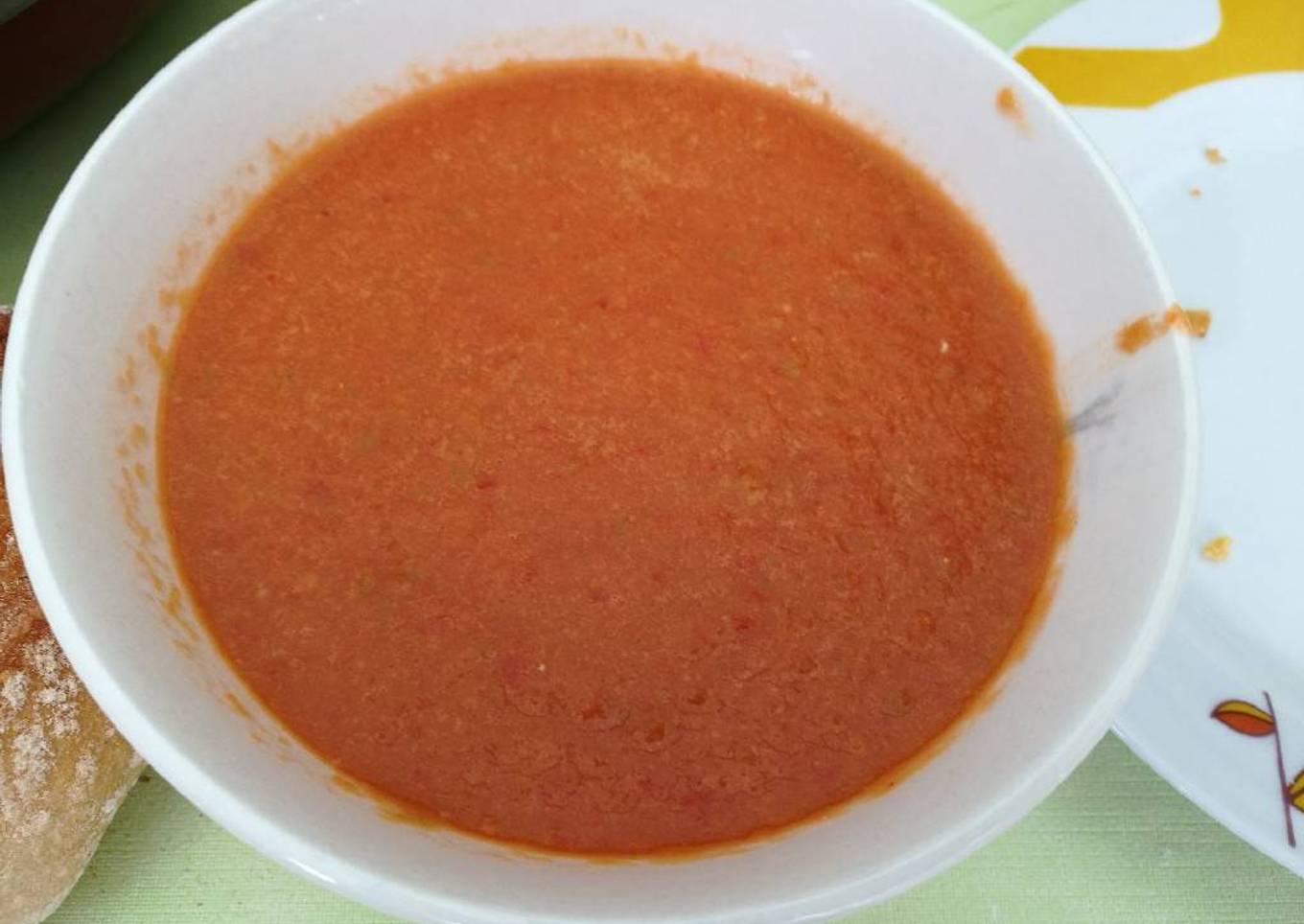 Me la enseñó mi primera suegra que era andaluza, ella la hacía con tomates naturales, pero en lata es más rápido y el sabor y color más fuerte y a mí me gusta más.
