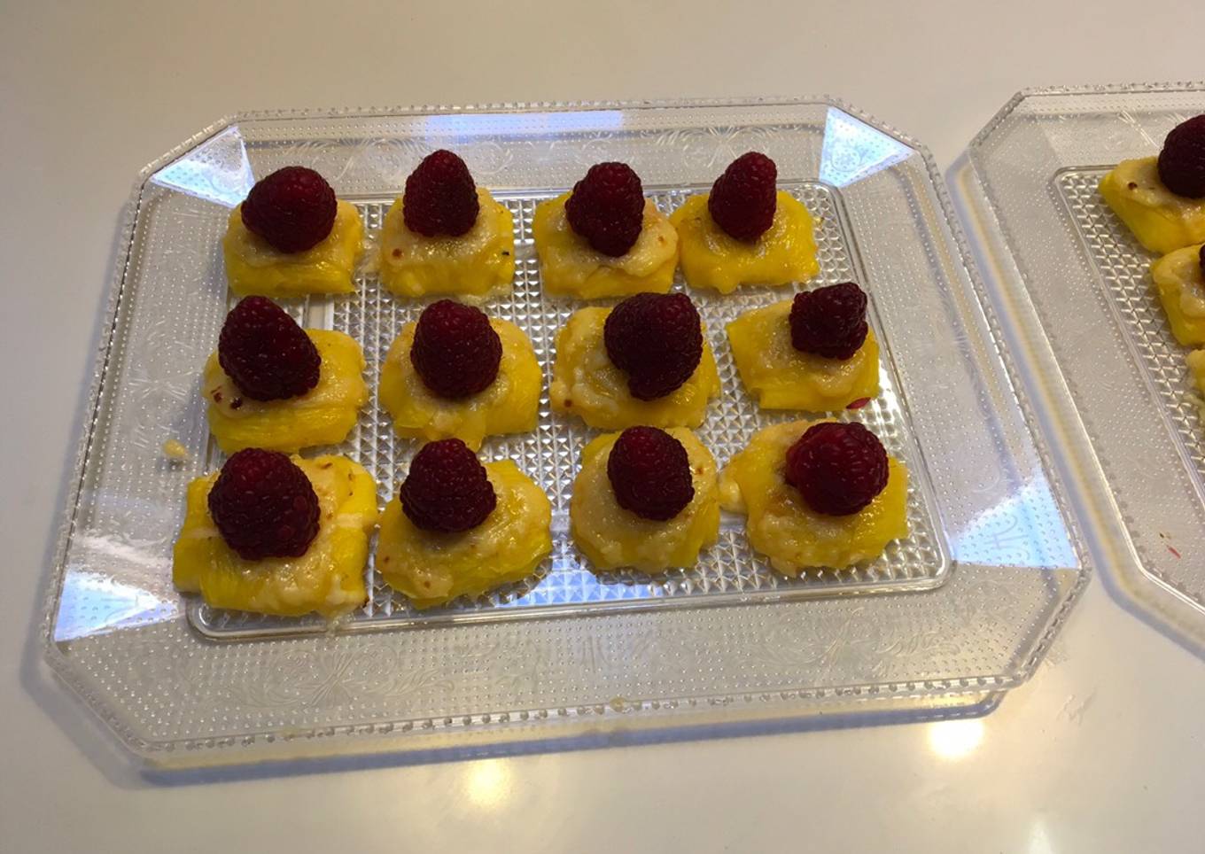 - Poner una pequeña cantidad de crema pastelera y una frambuesa. Hace 4 cortes laterales y envolver como esta en la foto