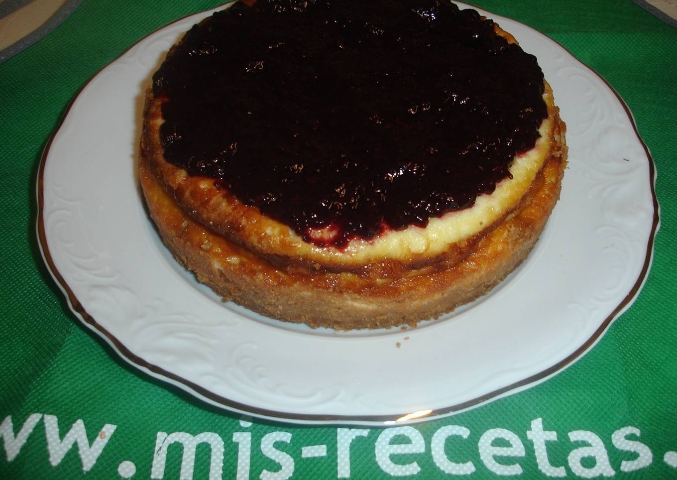 - Una vez este enfriada, pasar a la nevera para que cuaje. Sacarla para desmoldar sobre un plato y añadir por la superficie la mermelada de arándanos y frambuesa.