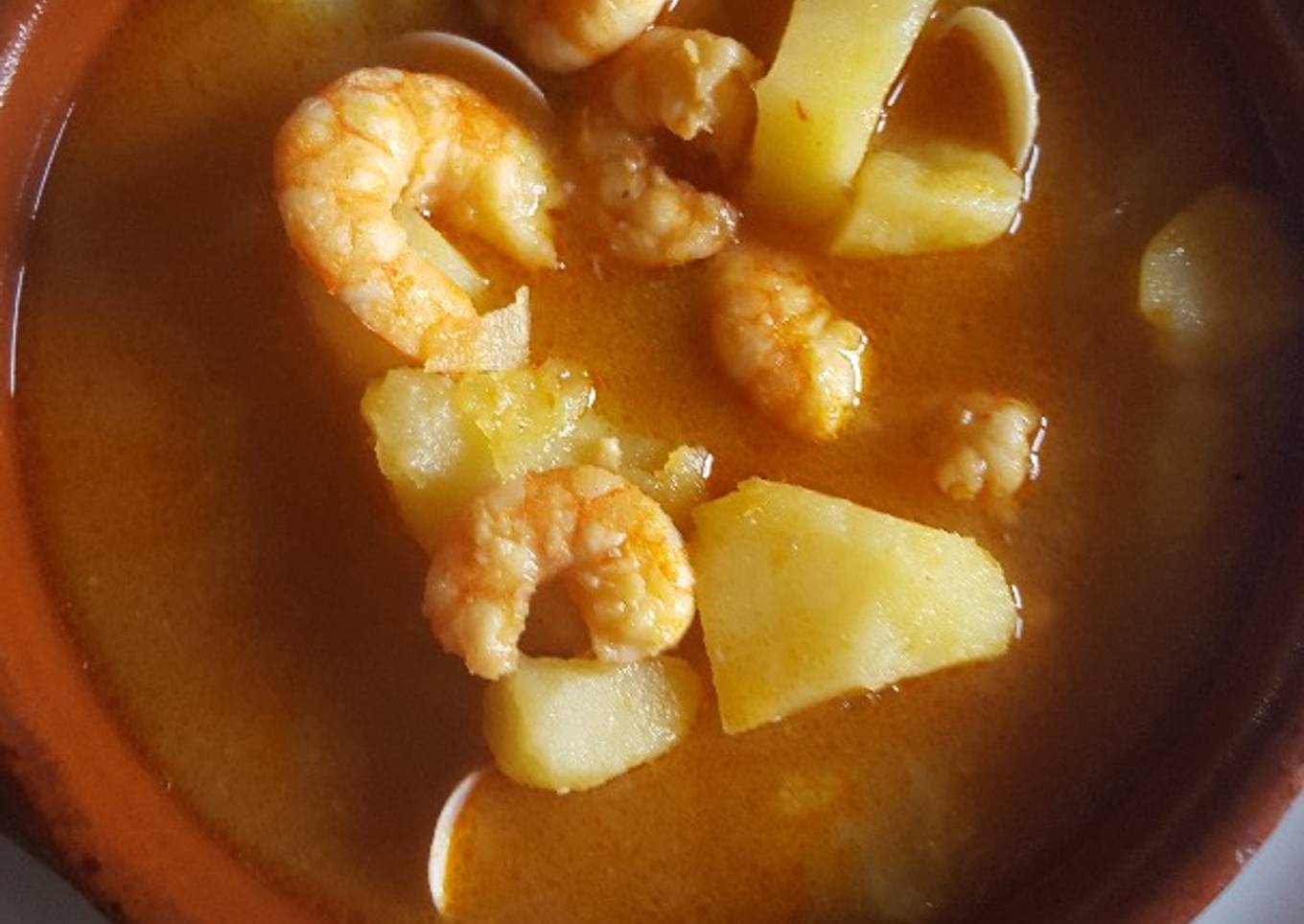 - Lo ponemos en una olla y le ponemos la patatas en cuadrados, las gambas y las almejas y dejamos cocer.