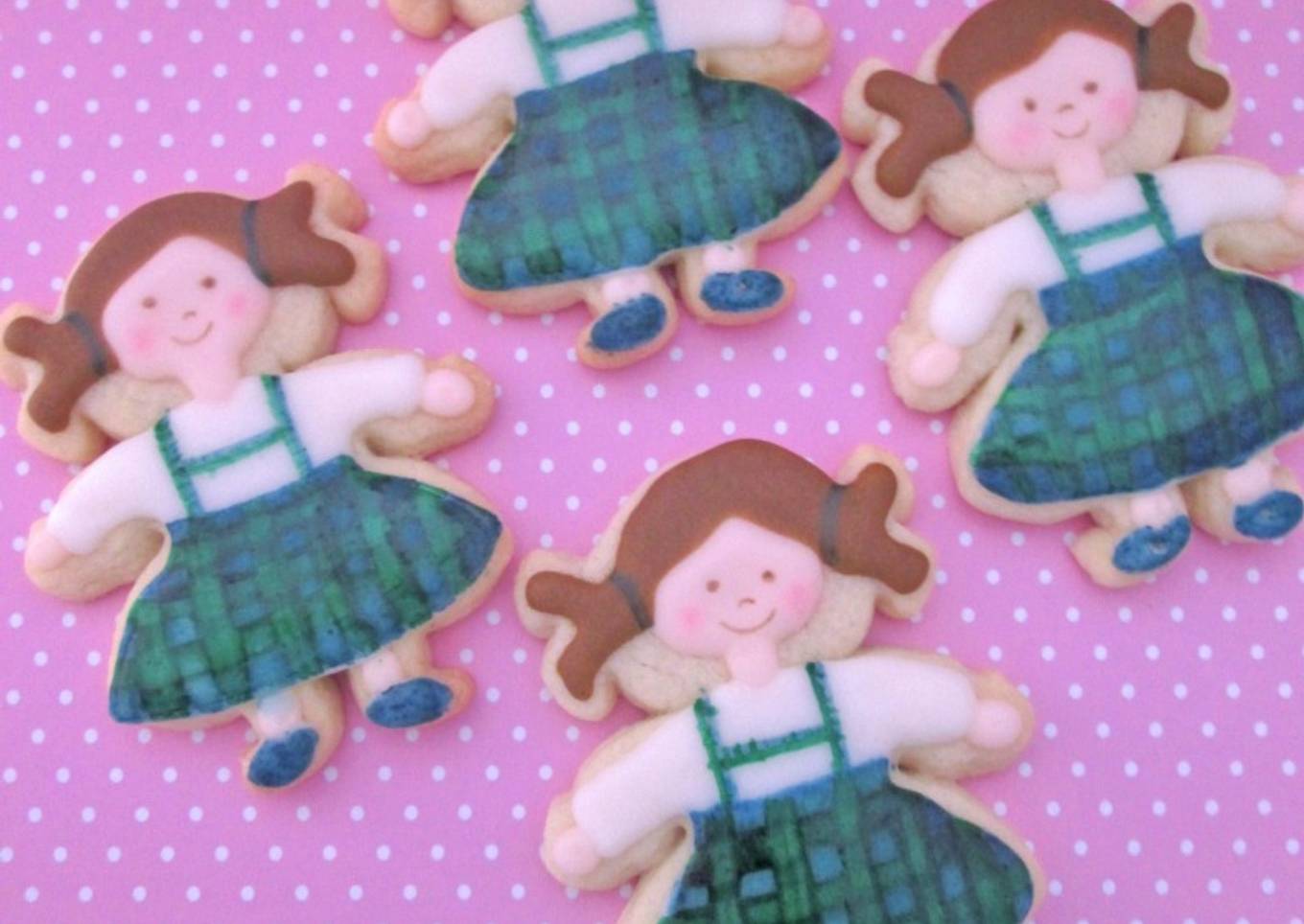 - Transcurridas 24 horas preparamos la pintura comestible. Para hacerlo diluimos en una paleta una gota de colorante azul con una cucharadita del licor. Disolver el colorante y pintar con un pincel, el vestido y los zapatos. Hacer lo mismo con el colorante verde. Con un pincel dibujamos los cuadros del uniforme de los dos colores. (No pintar del siguiente color hasta que el primer color no se haya secado).